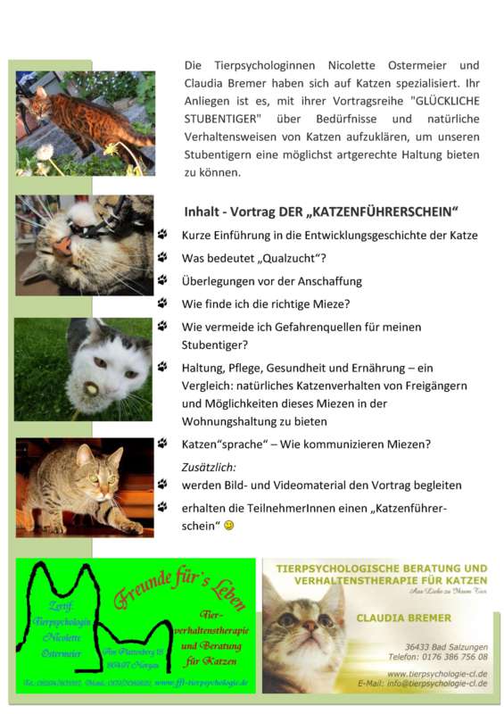 Sowohl für erfahrene Katzenbesitzer als auch für künftige Katzenhalter wird es viele Anregungen geben, Sie werden auch Gelegenheit haben Fragen zu stellen. Der Vortrag beginnt um 13.00 Uhr und endet ca. um 16.00 Uhr.