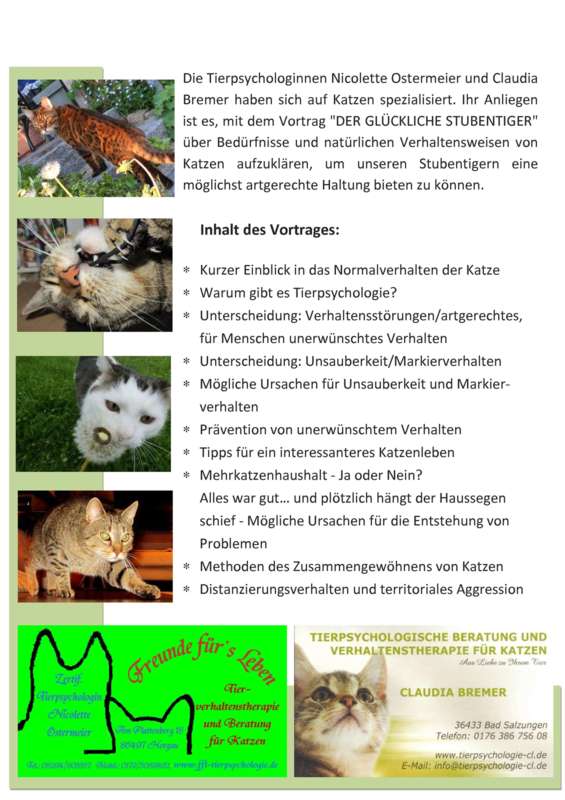 Am Sonntag, dem 13.03.2016, bieten wir Katzenfreunden einen neuen Vortrag der Tierpsychologinnen Claudia Bremer und Nicolette Ostermeier an. Die voraussichtlichen Inhalte werden sein: